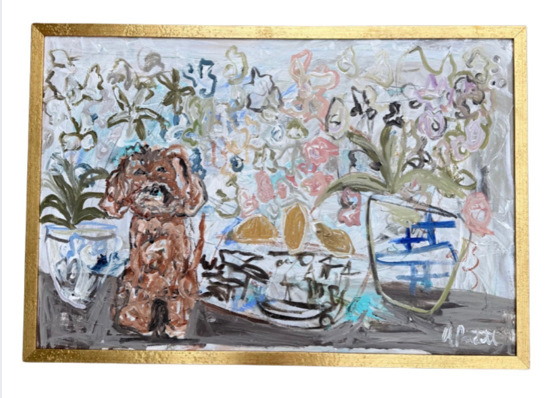acrylic, oil pastel, and charcoal on panel with gold frame